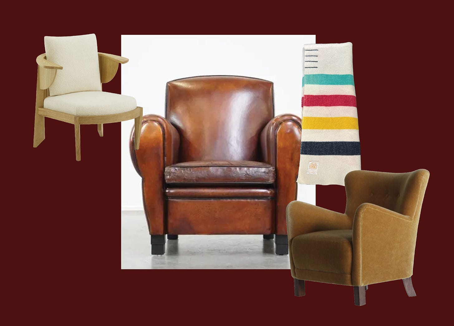 Focusing on smaller armchairs to flank the fireplace brings softness without crowding the room. Each of these chairs has a classic profile and a modest footprint, offering comfort without unnecessary bulk. Draping a traditional American Pendleton blanket over one adds warmth and texture, a quiet nod to craftsmanship and heritage without feeling overly symbolic.