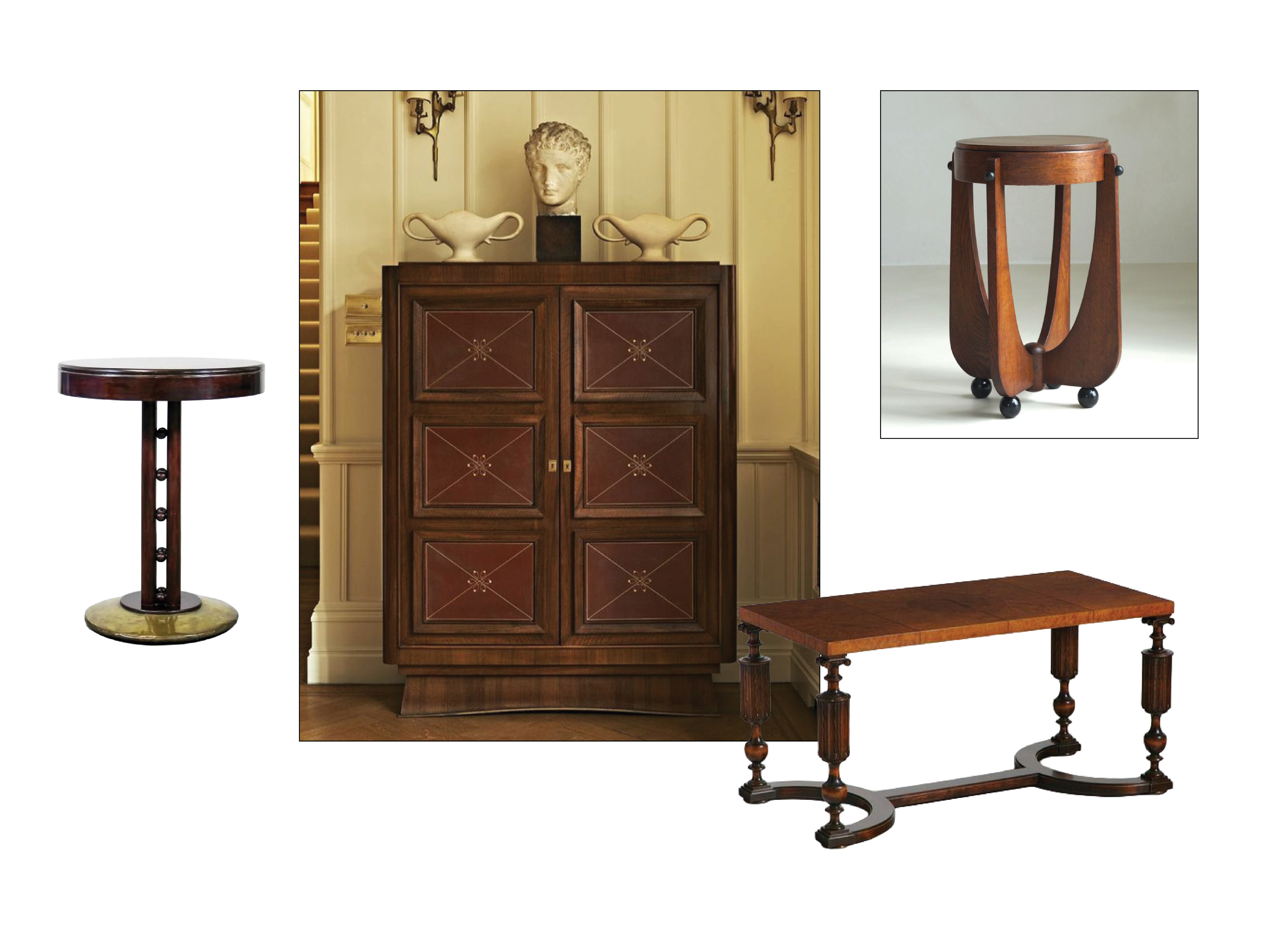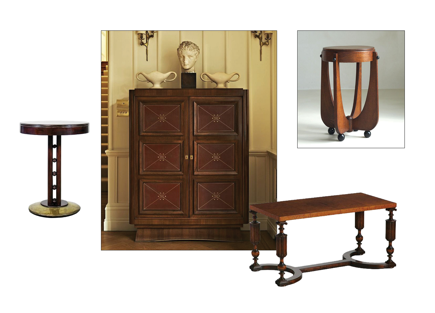 A collection of tables and casework with sculptural lines and rich wood tones. These pieces bring warmth, craftsmanship, and dimension to the room, offering functional surfaces that feel both historical and fresh without tipping into heaviness or ornament for ornament’s sake.