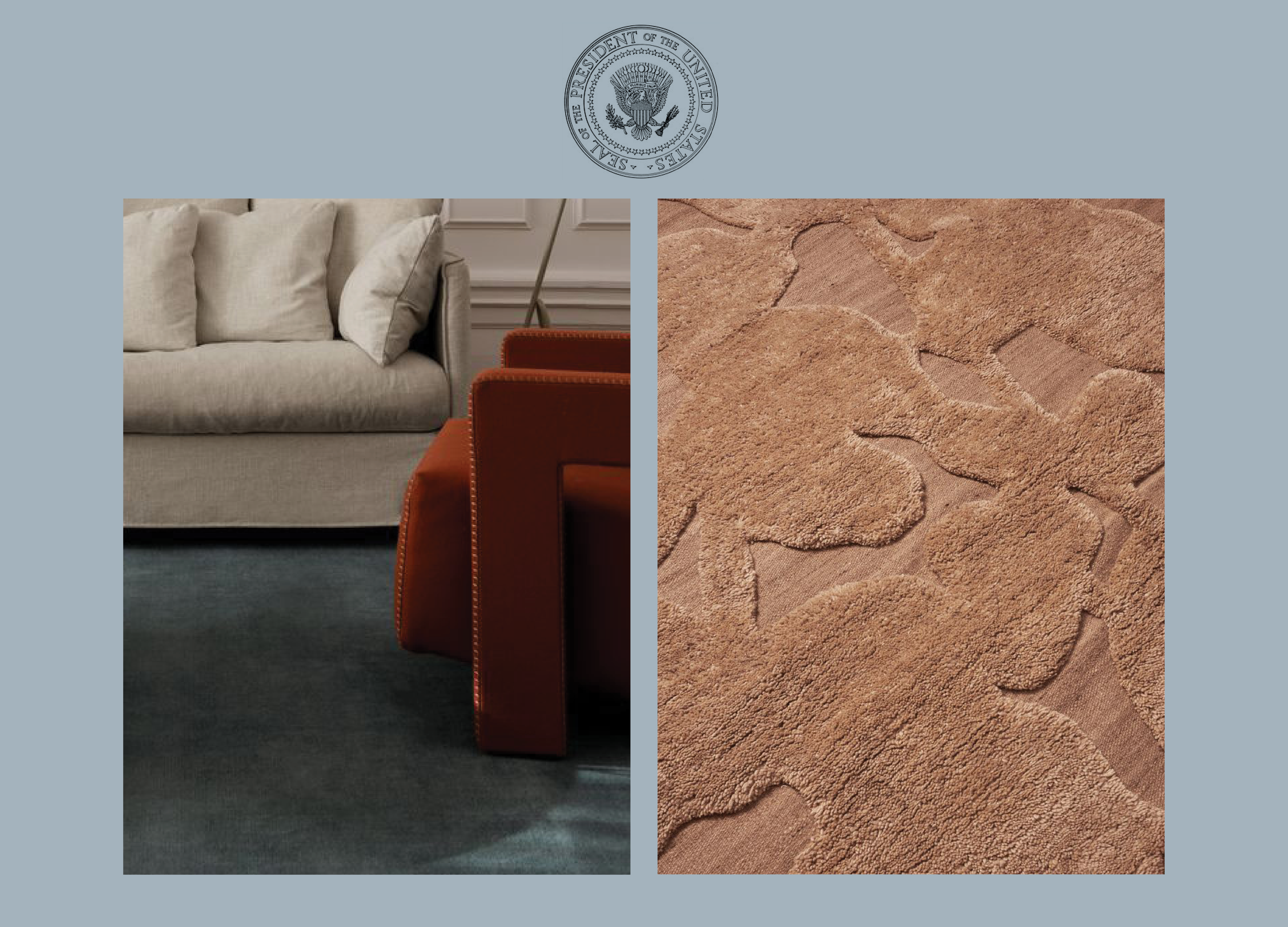 The Oval Office carpet almost always features a full-color version of the presidential seal, which can feel overly literal. I would rather take a more subtle approach by translating the seal into a tonal relief. The symbol would still be present and respectful, but it would read as texture instead of illustration. This creates a quieter, more sophisticated surface that allows the room’s furnishings and architecture to breathe while still honoring the office’s history.