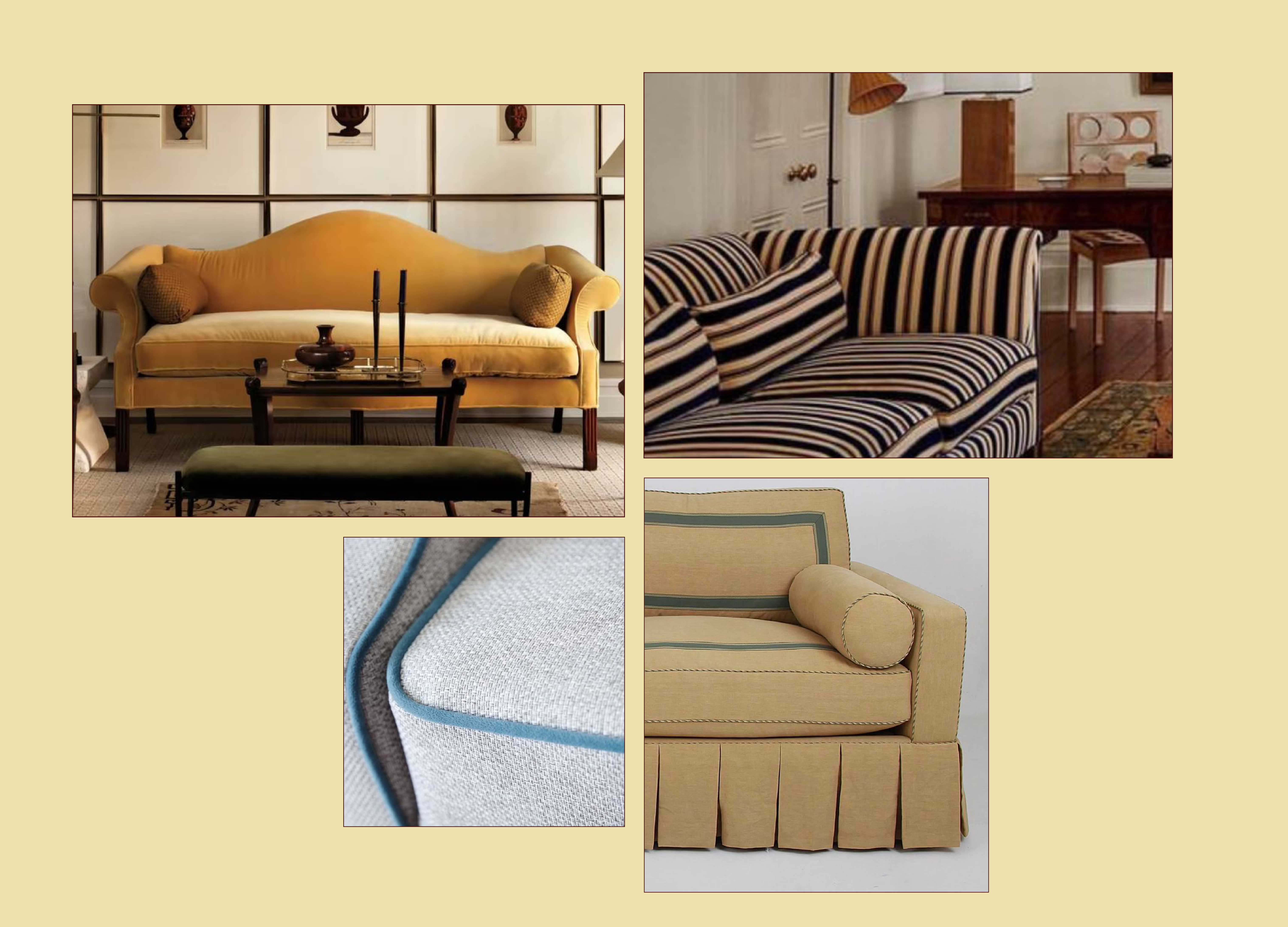 The sofas I’m referencing bring together exactly the mix of eras and geometry I want for the Oval Office. The yellow camelback silhouette offers a historical nod without feeling dated, thanks to its clean lines and unfussy profile. The striped piece brings in that crisp, almost nautical geometry that could easily be adapted into a subtle flag-inspired motif. And the pale upholstery with bold blue piping shows how a simple color shift can feel both fresh and deeply American without becoming literal. Even the pleated skirt on the last sofa has a tailored grace that feels right for a room of this scale. Together, these pieces show how the sofa can bridge tradition and modernity, offering pattern, structure, and symbolism without falling into the overdone filigree trap of past administrations.
